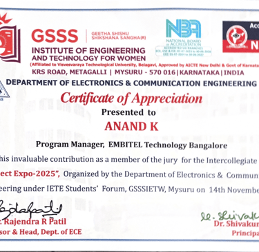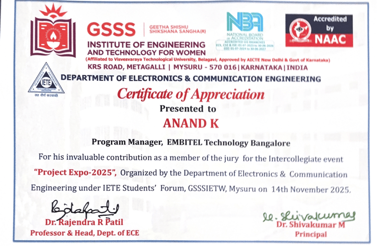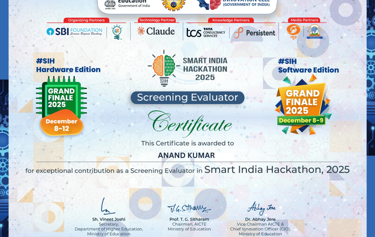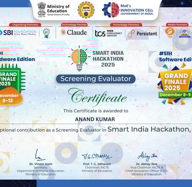 Recognized by engineering colleges and national-level initiatives under the Ministry of Education, Government of India, for serving as a Jury Member and Evaluator for inter-college engineering project competitions and the Smart India Hackathon (SIH)